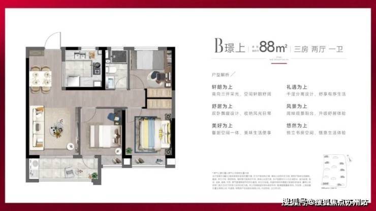 该户型在88㎡户型的基础上,将尺度进行了升级,而且还是双卫的设计,受众面比较广,无论是刚需上车还是改善换房都非常适合。
