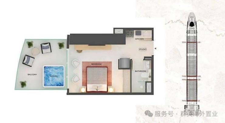 面积:42.9㎡~49.51㎡(单间+一卫+泳池)