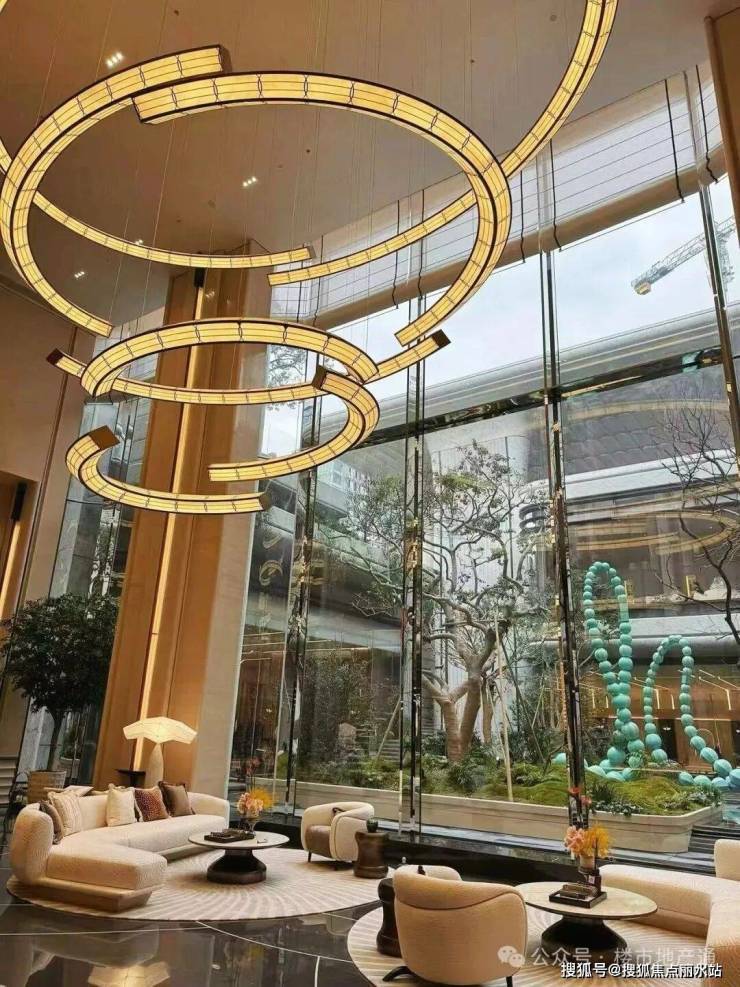 进入序厅之后,一大块高度12米的落地玻璃映入眼帘,把下沉式庭院的景观引入室内,归家仪式感拉满