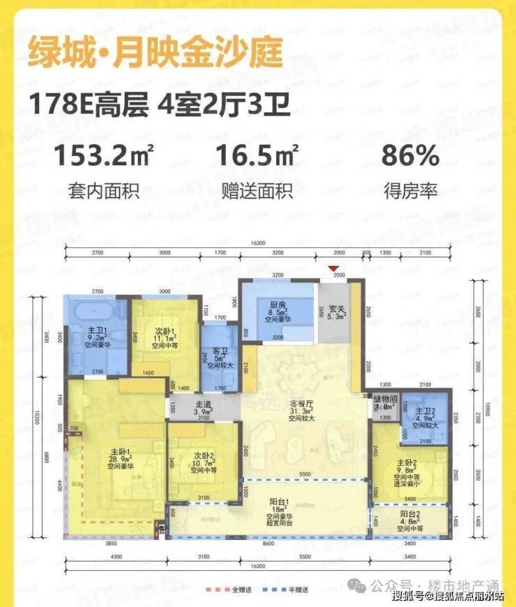 178方南厅户型:4房2厅3卫,得房率86%