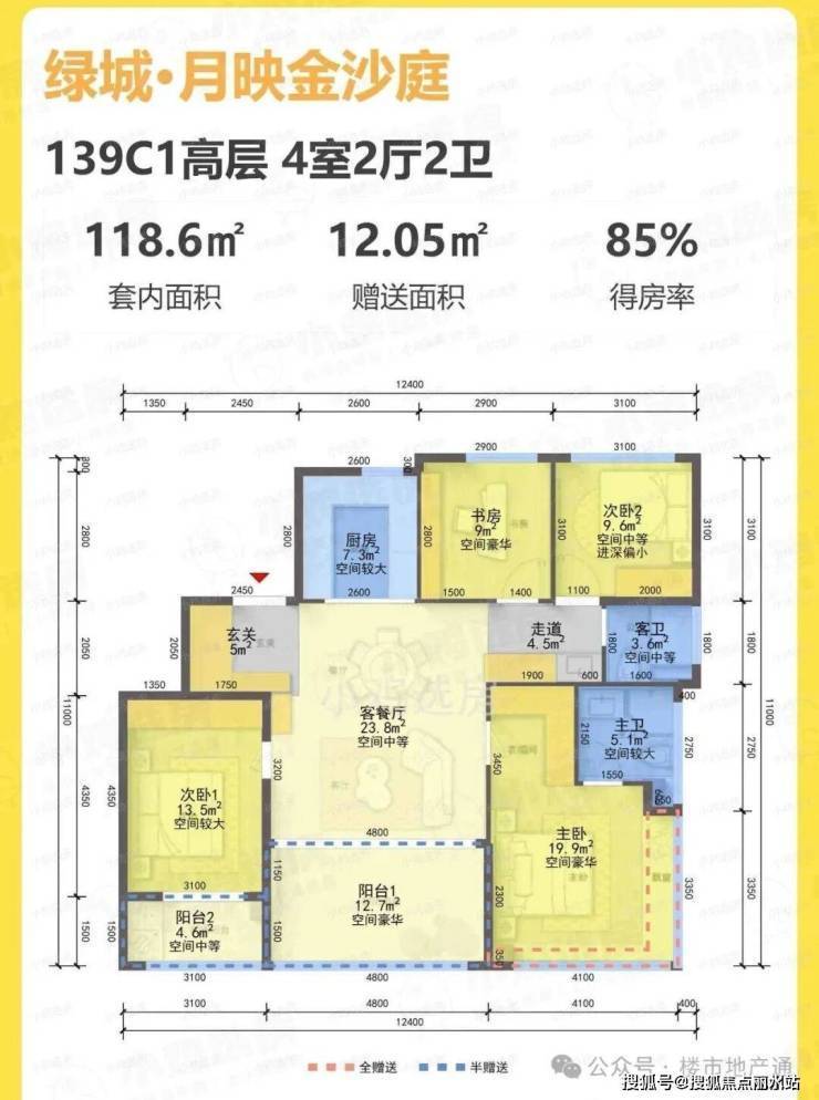 139方南厅户型:4房2厅2卫,得房率85%