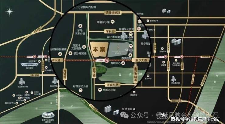 项目位置:杭州市金沙大道与松合路交汇处(一号线下沙西站地铁口B出口)。南临金沙大道,西靠乔下路,北接玉湖街,东至松和路;