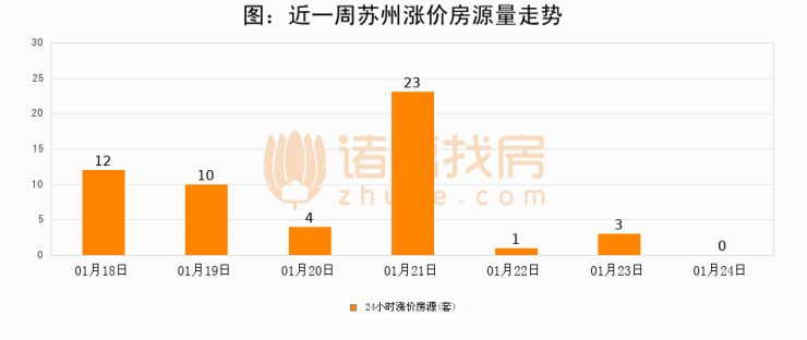 根据诸葛找房数据显示,苏州24小时涨价房源量为0套,较01月23日减少3套,环比下降100%。与此同时,涨价房源占比小幅回落,对于购房者来说是一个入市窗口期,购房者可抓住时机入市。