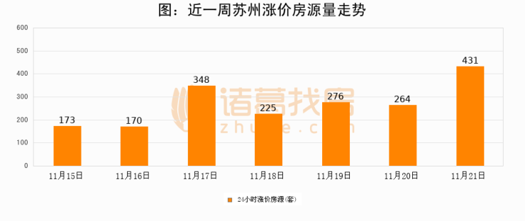 根据诸葛找房数据显示,苏州24小时涨价房源量为431套,较11月20日增加167套,环比上涨63.3%。与此同时,涨价房源占比小幅扩大,业主信心有所提升。