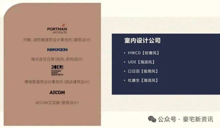 项目设计方来自著名建筑事务所-Portman Architects(上海商城的缔造者),以及日本的日建设计株式会社—Nikken Sekkei和博埃里建筑设计咨询有限公司共同设计,真正的强强联合,建筑风格十分有特色:楼体形似金字塔,底层架空打造了水景大堂。整个立面与外滩华尔道夫系出同门,充满未来主义又自带经典Artdeco风格。
