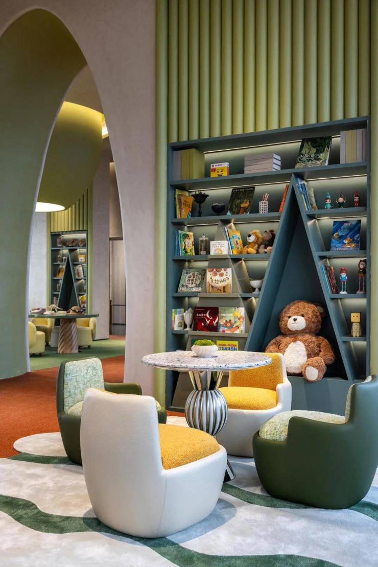 第二个,“向阳而生”。运用大面积的落地玻璃窗,让这个区域变的更加透亮。让绿意充分渗入,实现近距离、无遮挡观景视野。试想一下那个画面,当家长在外奔波一天,回家的路上,看到暖暖的光从玻璃盒子中映射,孩子笑的天真烂漫,回家的脚步也会不自觉的变得轻快了。