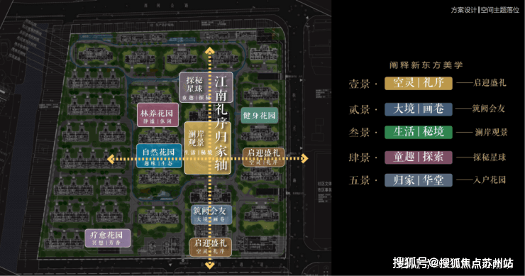 以江南人文精神为源点,打造两轴一环五进空间,江南礼序归家轴串联启迎盛礼、筑阙会友、归家华堂等5重礼制,尊崇归家;健康运动轴以24小时跑道为社区活力生活环,串联儿童乐园、长者康养、疗愈花园等10大生活场景,营造全龄全时的江南诗意生活。