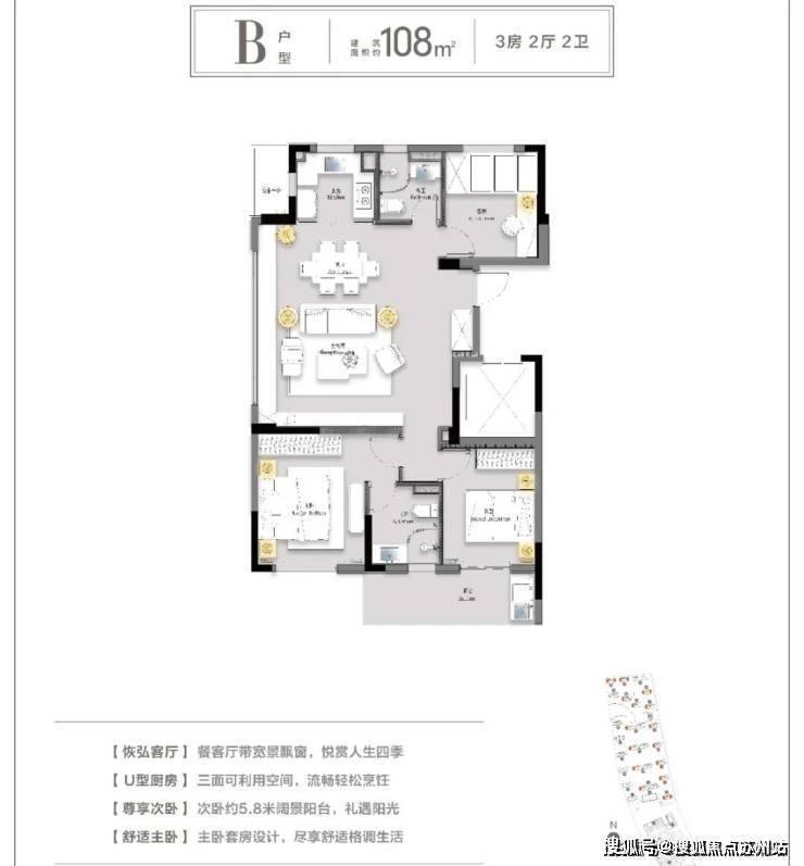 建面约108㎡户型就略带一些改善的意味了。高端项目常见的大边厅,营造了客厅、餐厅、厨房开放打通的“LDK一体化”模式,使空间感更加通透。U形厨房让动线更加流畅顺滑,尺度感甚至可以和市场上一些改善产品不相上下。