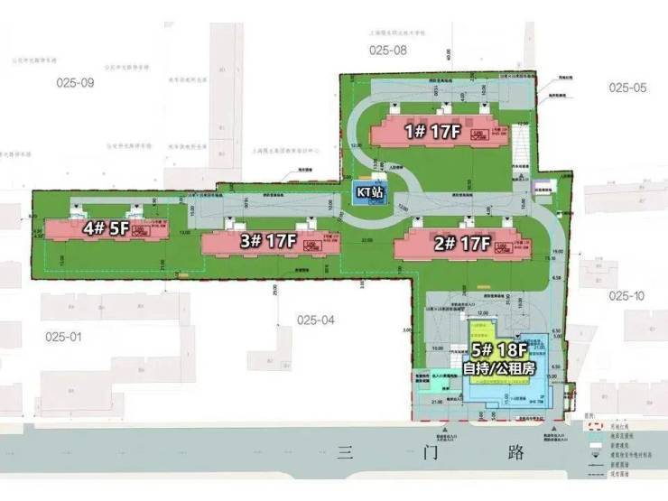 根据设计方案显示,项目拟建三栋17层商品住宅 、一栋5层商品住宅、一栋18层公租房、自持租赁住宅及配套楼(其1-2层为菜场)和一栋1层的KT电站,并设置2层地下车库。在三门路设置机动车出入口、消防应急出入口及人行出入口。