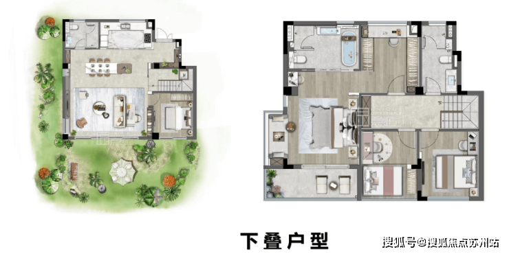 下叠户型一层为公共活动区域,二层为生活休憩区,整体的空间较为宽敞。