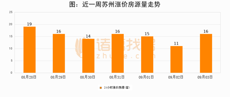 根据诸葛找房数据显示,苏州24小时涨价房源量为16套,较09月02日增加5套,环比上涨45.5%。与此同时,涨价房源占比小幅扩大,业主信心有所提升。