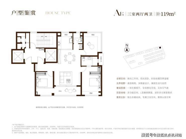 建面约120㎡的舒适三房:以经典的飞机户型实现南北通透,其约4.8米面宽客厅与7.95米的南向双阳台,将阳光与美景充分引入室内。