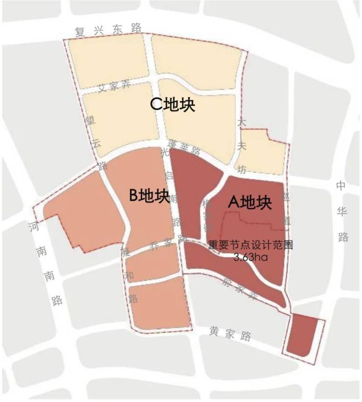 整个乔家路地块由于规模较大,总体方案设计范围:东至中华路,南至黄家路,西至河南南路,北至复兴东路,用地面积约 24.11公顷 。