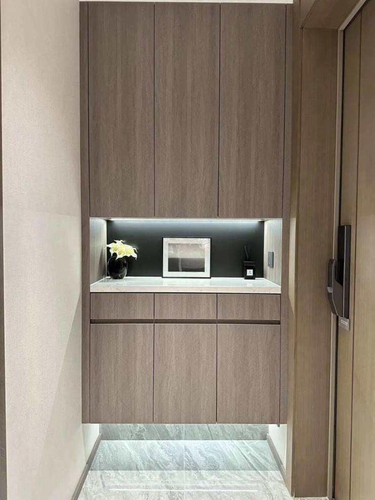 入户玄关更是设计了大量的收纳空间。底部架空,可以用来摆放鞋子,并设置有嵌入式灯带,整体的氛围感拉满。