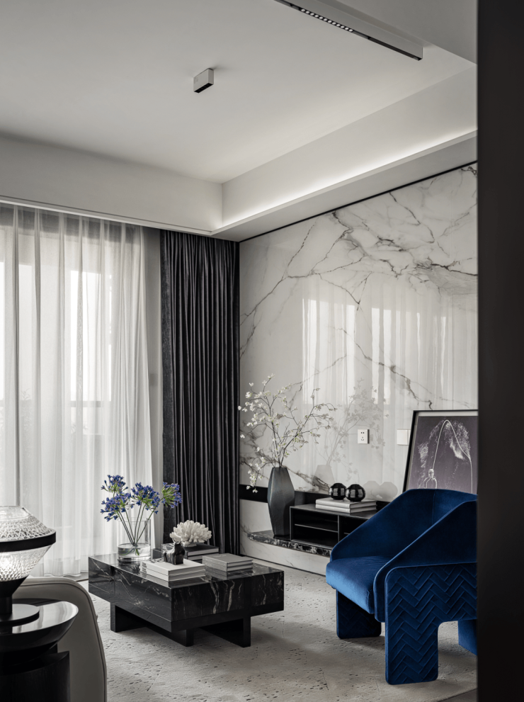 同时,社区内部景观打造了大面积的叠级水景,搭配普拉达绿大理石和浪淘沙石材,呈现整体空间的隐奢基调。
