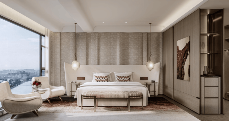 二层主卧同样大面积采光窗设计,搭配双一字衣帽收纳与奢华卫浴空间,营造极致的尊崇体验与私密享受。