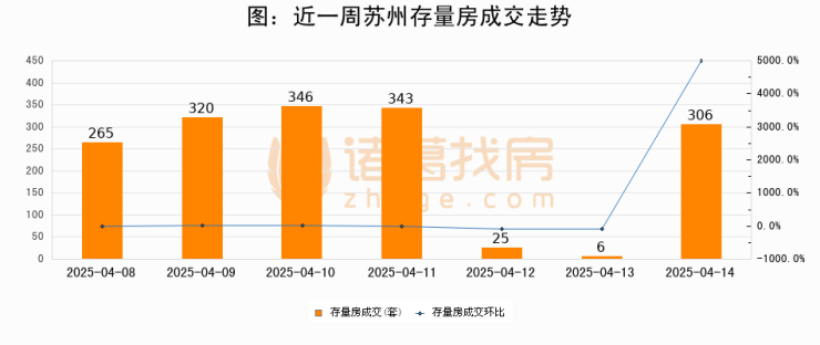 从存量房来看,2025年04月14日苏州存量房单日成交306套,比昨日增加300套,环比上涨5000%。从近一周存量房成交来看,苏州存量房日均成交套数为230套,04月14日单日成交306套,高于近一周平均水平33%。