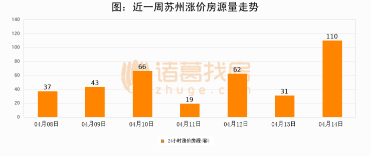 根据诸葛找房数据显示,苏州24小时涨价房源量为110套,较04月13日增加79套,环比上涨254.8%。与此同时,涨价房源占比小幅扩大,业主信心有所提升。