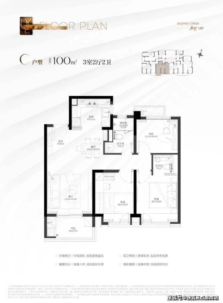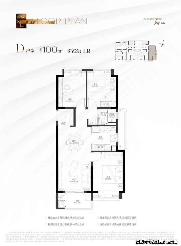 建筑面积约100㎡3房D户型:南北通透的设计让该户型拥有更加优秀的通风效果.而且这个户型做到了全卧飘窗(3个飘窗)+南向瞰景大阳台,丰富的灵动空间提升了实得面积!