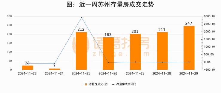 从存量房来看,2024年11月29日苏州存量房单日成交247套,比昨日增加36套,环比上涨17.1%。从近一周存量房成交来看,苏州存量房日均成交套数为154套,11月29日单日成交247套,高于近一周平均水平60.4%。