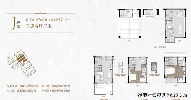 一楼和地下室主社交和志趣,二楼是子女的房间,三楼是主人休憩区。
