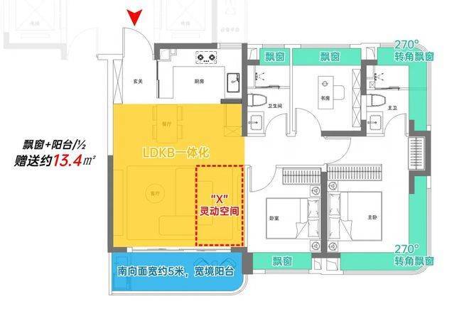 经典动静分离户型,LDKB一体化设计,三开间朝南,南向整体面宽约11米,搭配约5米宽境阳台;
