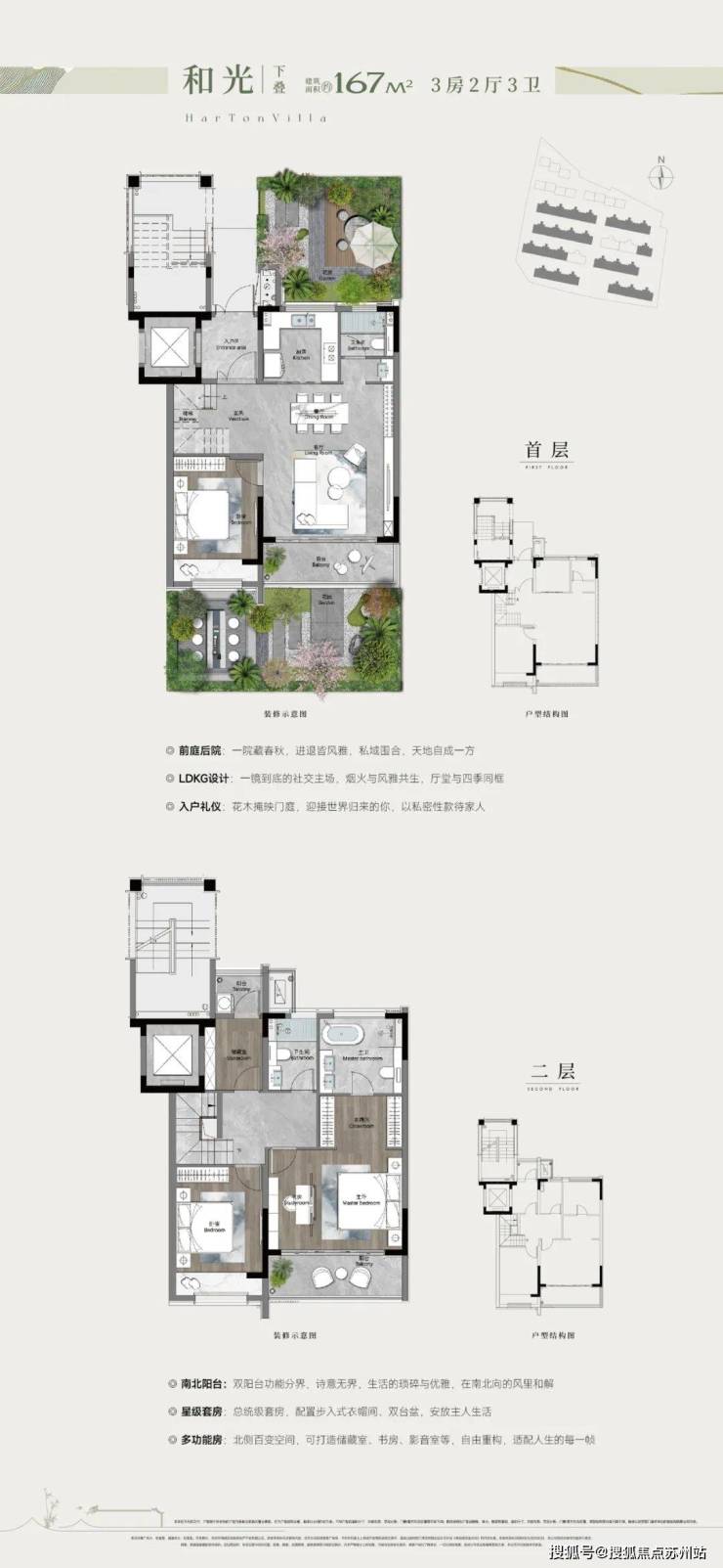 墅区采用街巷式聚落布局,实现了从公共空间到私密领域的有序过渡,以低密产品,形成“宅中有园,园中有屋,屋中有庭,庭外为坊,坊间成园”的五重归家院境。