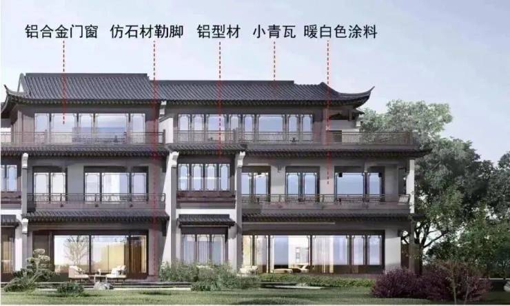 建筑风格来看,也是中式风格,效果图上来看,外立面用的是铝合金门窗、仿石材勒脚、铝型材、小青瓦和暖白色涂料,这也基本跟绿城桃源里的合院是一样的。