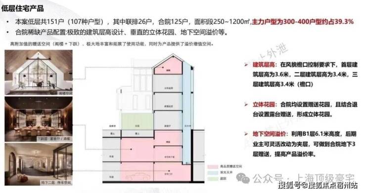 4.上海风貌层高最高的产品,很多户型层高:地下6.1米,一层3.9米,二层3.6米,三层3.6米