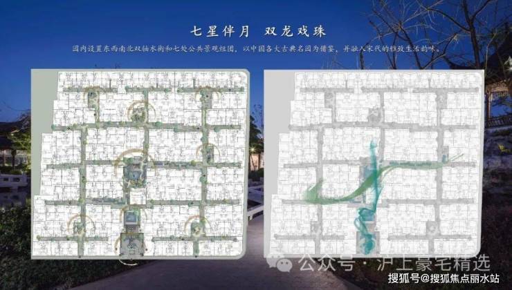 园内布局五进制南北主轴、以及“双龙戏水”格局的双水街,巷道联通,设七大景观组团,形成“一环、两轴、七境”布局.175席中式园宅,依巷分布南北,横平竖直,秩序井然.
