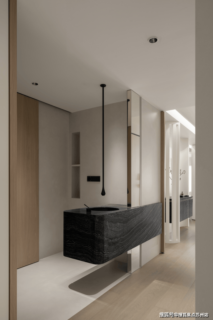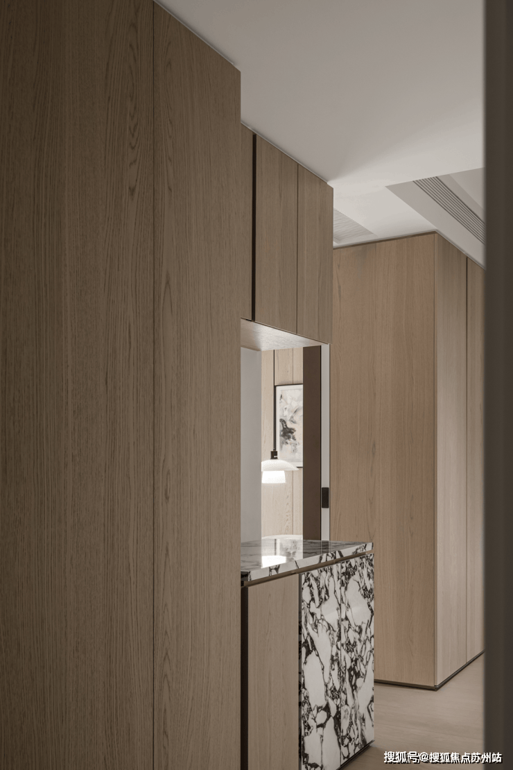 在视觉统一的图景前,窥见多层透景,点缀黑白分明的大理石纹理,深化木饰面的自然性,演绎主次协调的气韵。