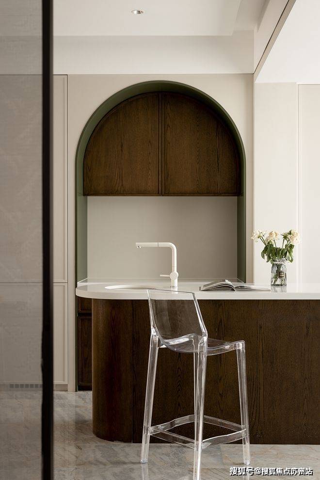 打造弧形岛台,延续柔美与简调,允许别致餐桌穿入其身,形成自然与想象之间的实体转译。