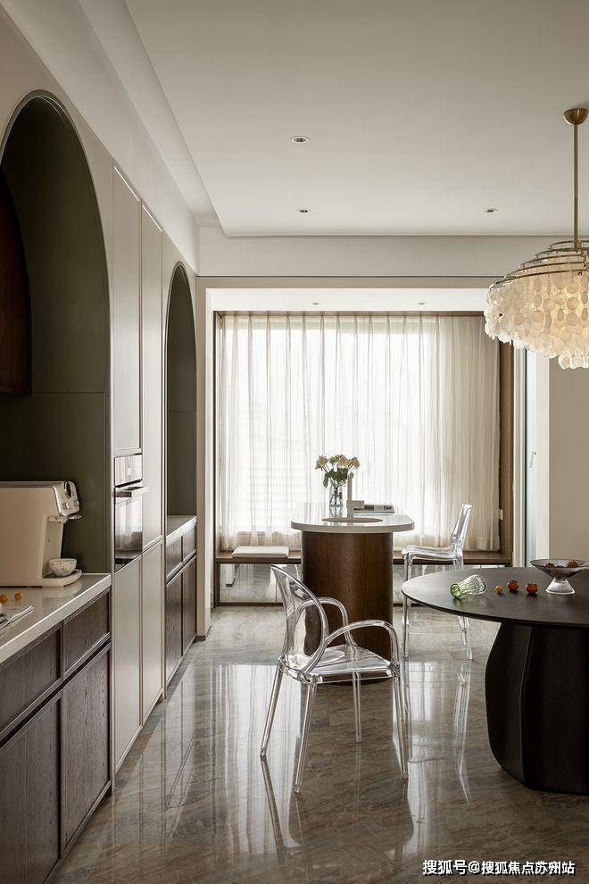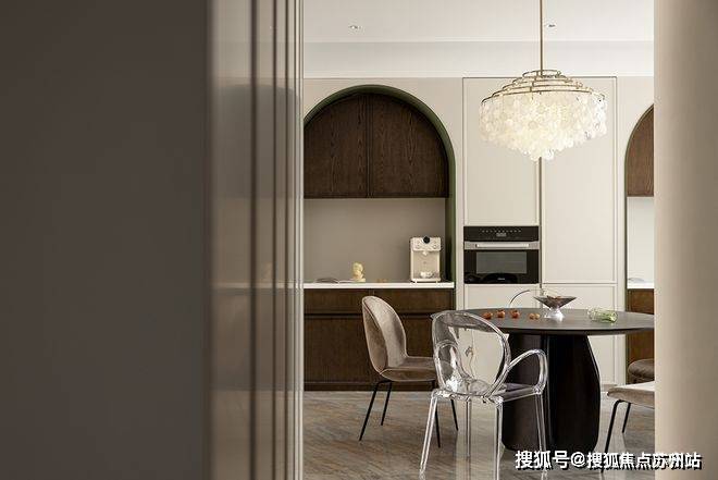 内置双拱门造型,利用空间穿插、错景,划分餐厅与西厨区,开放互动气质与当代审美相结合,隔而不断,界而未界,留给空间更多的想象和延伸。