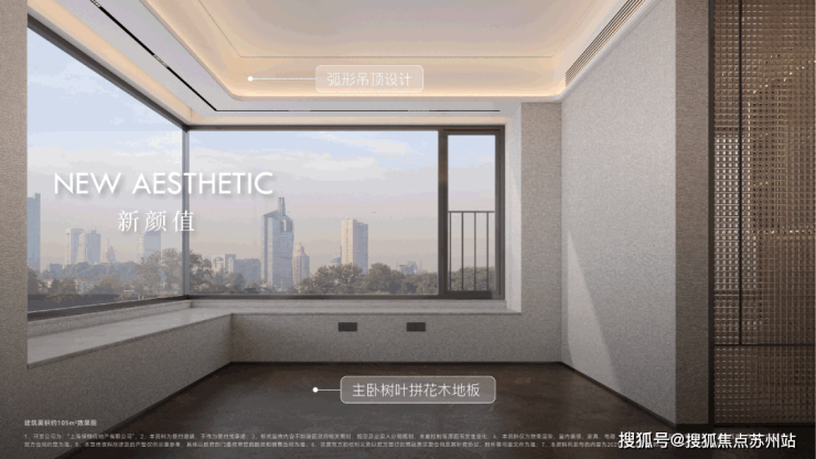 项目大量使用奢石设计,客厅 四边弧形天花、主卧 树叶拼花地板、精致优雅的 骨骼线设计,都是开发商花费更大成本和耗材去呈现更美的视觉体验。