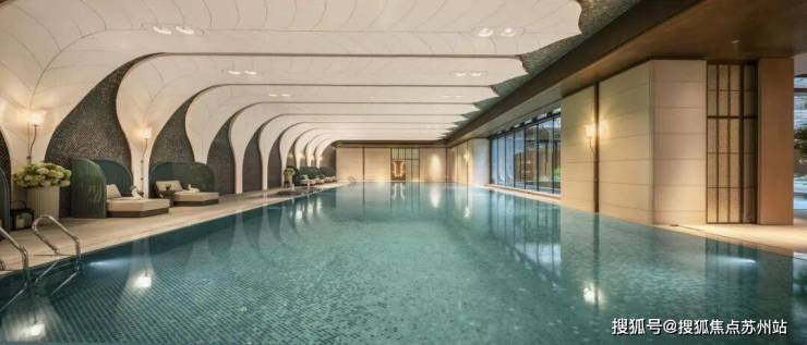 恒温泳池:第一,采用了景德镇烧制的陶瓷马赛克,独特的釉面色彩由 景德镇老师傅手工浇筑而成,充满人文艺术底蕴;第二,羽毛天花造型,由 600余件铝板打造,表面采用了仿贝壳纹的艺术漆处理,带来松弛度假感;第三,不仅配置了约25m×10m的4道泳池,还采用了 奥运会同款空调除湿系统,彰显高档品质细节!