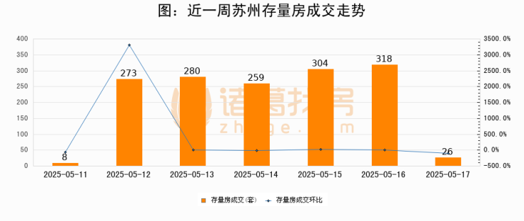 从存量房来看,2025年05月17日苏州存量房单日成交26套,比昨日减少292套,环比下降91.8%。从近一周存量房成交来看,苏州存量房日均成交套数为209套,05月17日单日成交26套,低于近一周平均水平87.6%。