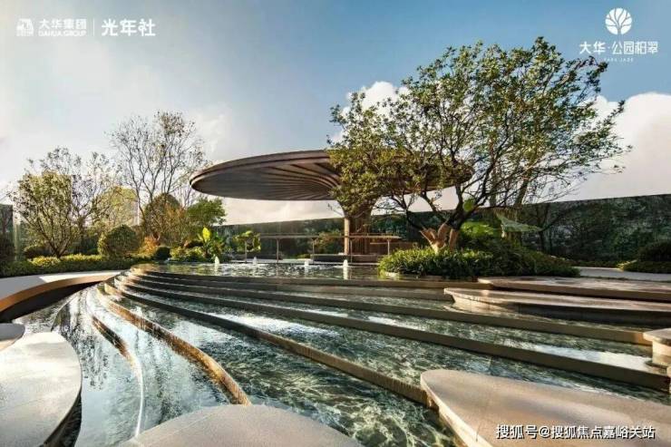 首先,大华公园柏翠利用12级叠水、2座树池、9步水上汀步,运用六重造景的手法打造近500平的中央水景!