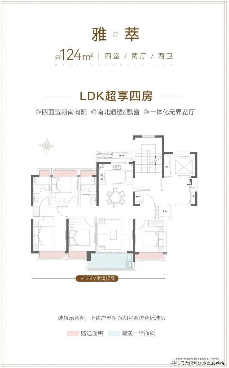 来看看更大一点的户型——建面约124㎡四房,同样是飞机户型设计,并拉伸至4开间,南向整体约12.8米面宽,空间感和舒适度拿捏到位。