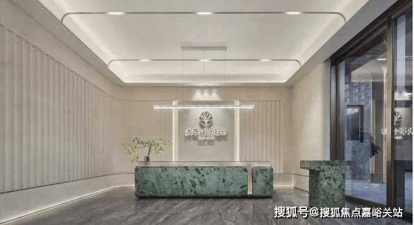 大堂接待台选用产自意大利山脉的宝格绿奢石一体打造而成。
