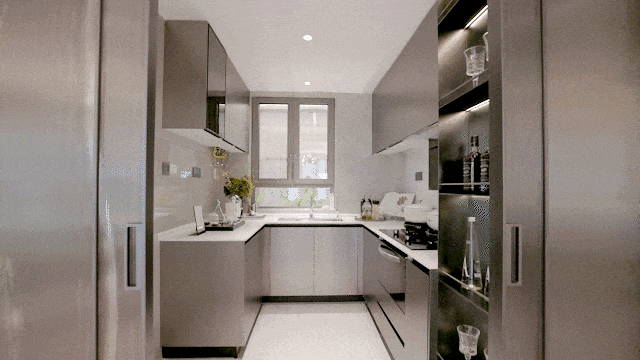 其次,厨房呈科学的U形设计,动线更为合理,无论下厨或是端饭,操作都非常便捷。
