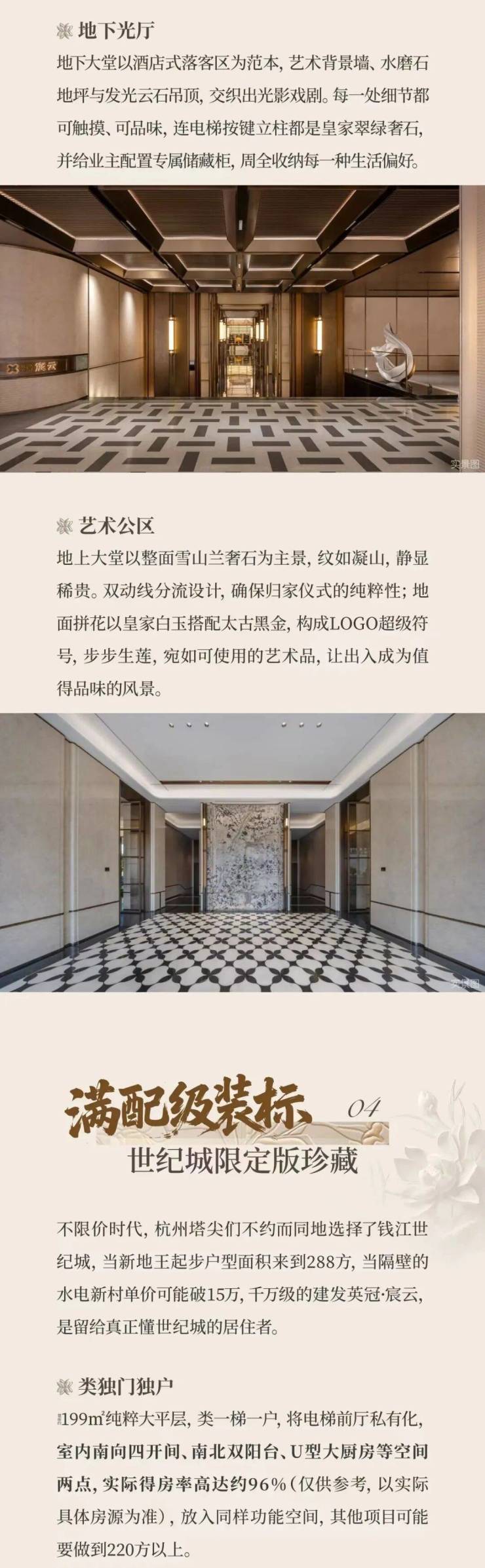* 项目均价处于板块天花板水平。您必须冷静评估:支付的溢价,究竟是购买了 **“眼前即享的顶级资源”** ,还是更多地购买了 **“未来预期的透支”** 。需要与钱江世纪城、奥体板块内其他品质二手房(如时代奥城、创世纪等)进行 meticulous 的横向对比,综合考虑得房率、装修标准、社区维护状态和即时入住成本。