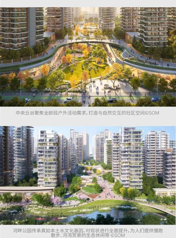 规划以“悦”、“赏”、“游”、“聚”四大主题为脉络,相应打造了仓廪市集,中央丘谷,河畔公园和桥水门户四大场所,并通过贯串全域的社区漫步景观带,将这些高品质公共空间有机串联起来,打造成为城绿共生、全龄友好、活力精致的大型高品质社区。