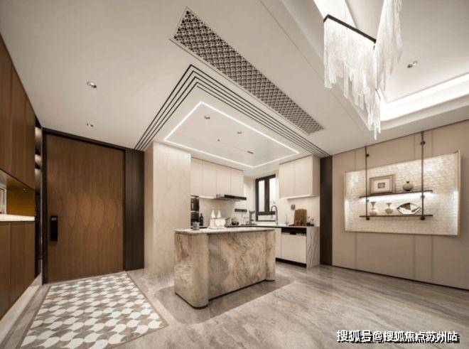 厨房方面,水波纹玻璃+金属造型玻璃移门,隐形上轨,厨房交付线性凉霸、末端饮水、博世或AEG(或同等品牌)烟灶、洗碗机三件套。