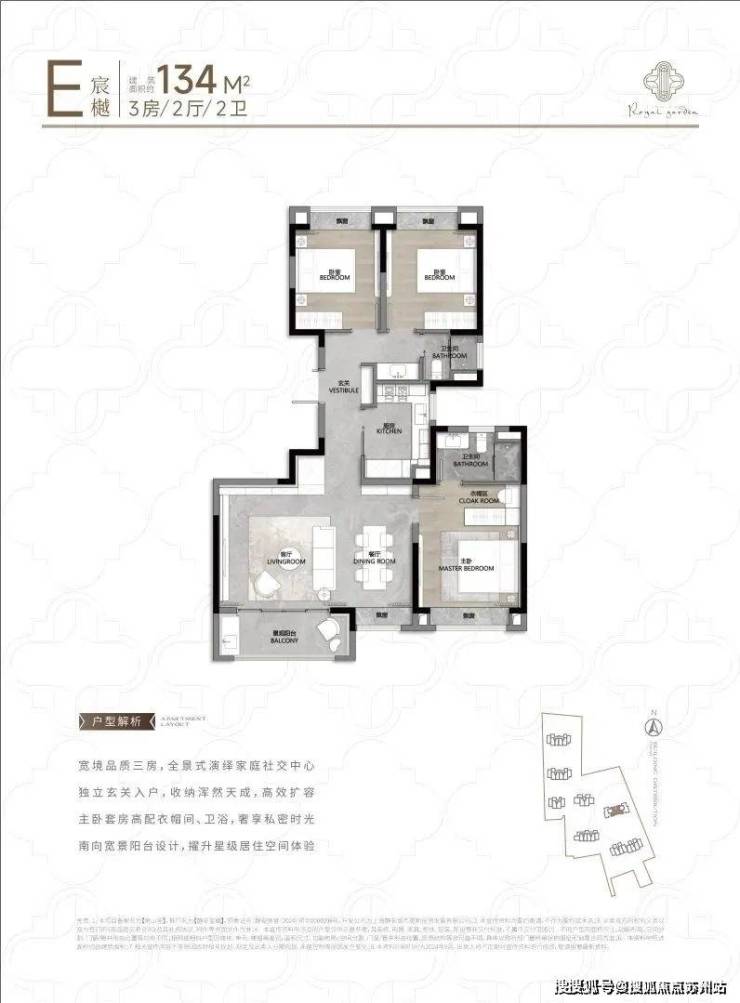 104㎡3户型特点:该户型多为楼栋的东边套,是一个观景户型。客厅连接270°阳台,视野出众。双卧朝南,阳光满溢。从次卫布局看,如果家庭人口较少,该户型还能做成双套卧。