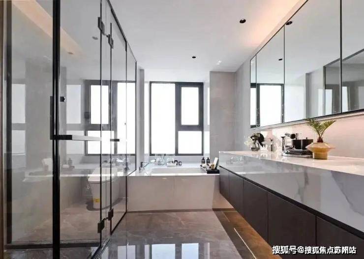 朝南大尺度飘窗带来全明采光,L型超大衣帽空间,女主人的衣服、包包都可妥善归置.值得一提的是,主卫不仅配备了双台盆,并且还做到了四分离设计,洗漱、淋浴、马桶、浴缸都在不同的空间,真正做到了私密而舒适.