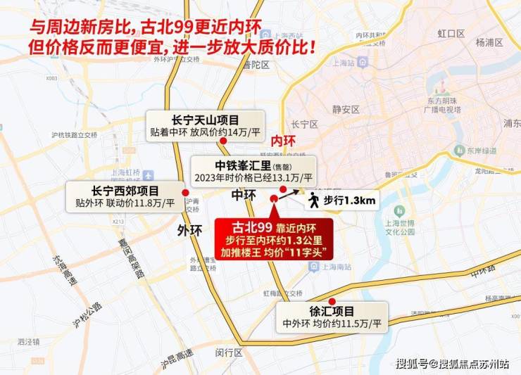 其次,古北99步行到内环只有约1.3公里,取证均价11.65万/㎡,而长宁天山项目贴着中环,预计14万/㎡;长宁西郊项目贴着外环,联动价11.8万/㎡。