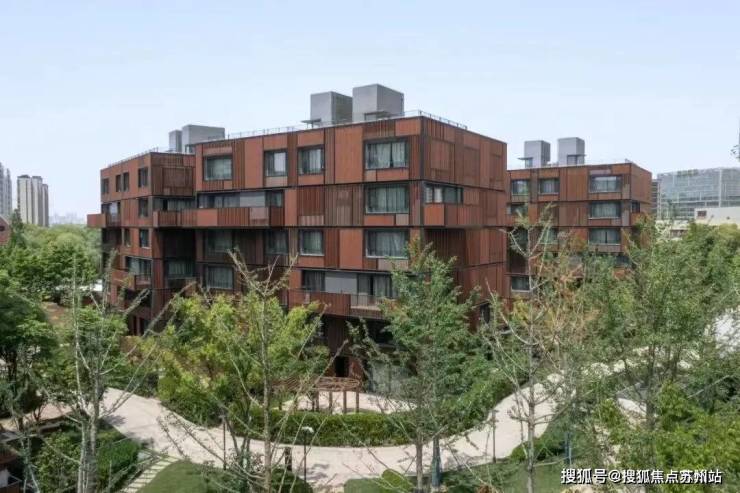 沁风雅苑,六层木色调的建筑坐落于郁郁葱葱的园林间,大面积玻璃窗、错落的露台,将视野向外延伸,又迎景入室,高低起伏的树篱与藤蔓,巧妙掩住露台和窗口,为建筑带来全新的诠释与解读。