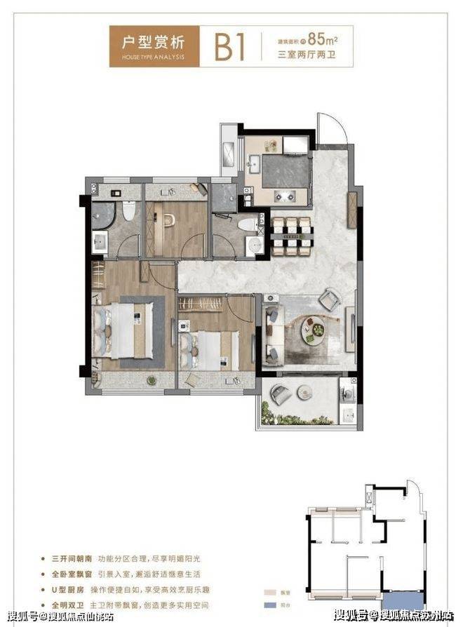 约85平三房户型,更是做到了三开间朝南,全卧室飘窗,拥有超大赠送面积,全明双卫,甚至主卫也附带飘窗,实用性拉满,而且该户型大部分房源总价在230万左右!