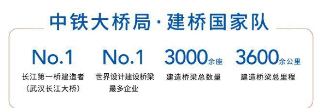 中铁大桥局集团前身为1953年修建万里长江第一桥“武汉长江大桥”经政务院批准成立的铁道部大桥局,是中国桥梁事业的领军者,是世界上设计桥梁最多的企业,中国“一带一路”走向世界的“建桥国家队”。在世界范围内建造桥梁总数超过3000座,建造桥梁总里程超过3600余公里,建桥技术国际领先。近70年来,公司曾先后参与建设了杭州湾跨海大桥、东海大桥、港珠澳大桥、武汉长江大桥、南京长江大桥等一系列知名桥梁,一直引领着中国桥梁事业发展方向,以建桥的心志去建造住宅。