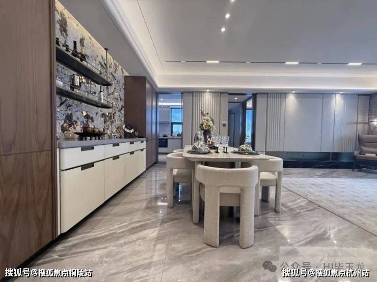 玄关间空非常宽敞,配置有定玄制关柜,出更入具仪式感。客厅餐区域,餐厅、电视背墙景面都是材石的,地面是瓷砖铺就,配置有定制餐边柜、弗兰卡水的槽和头龙等。